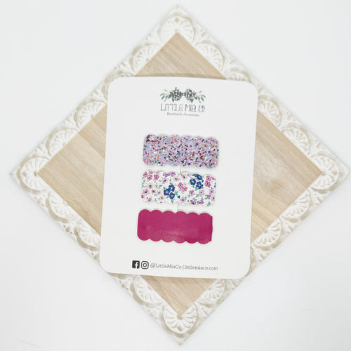 Purple Pink Floral Glitter 2” Snap Clip Trio